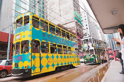 车身印有“庆祝香港回归祖国26周年”“世界献血者日”“全民国家安全教育日”等主题海报的“叮叮车”缓慢行驶在港岛街头。在行色匆匆的人群中,“叮叮车”宛如一道流动的风景线,成为市民了解社会的“窗口”。