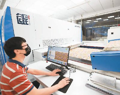 浙江省绍兴市柯桥区推进纺织印染业转型升级工程,引导企业应用环保设备和先进工艺,推动行业创新发展。图为浙江鸿大印染集团有限公司员工操作国内自主研发的数码打印机打印花样。