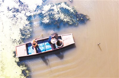 图为蟹临门太湖蟹共富养殖基地内,蟹农在养殖基地内捕捞太湖蟹,水面上漂浮的是用于生态养殖的浮萍和水草(无人机照片)。
