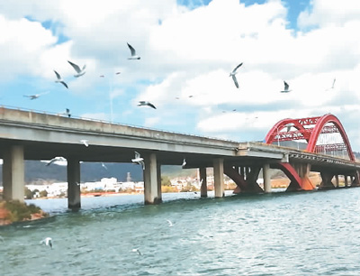红嘴鸥在昆明滇池海口特大桥附近飞翔。 |