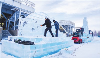 为进一步挖掘冬季旅游潜力,打造特色冰雪旅游品牌,今年,新疆生产建设兵团第十师北屯市以“冰雪+文化+体育+旅游”为主题,打造冰雪欢乐谷,游客可以在欢乐谷里体验滑冰、滑雪圈、拉冰爬犁、赏冰雕等冰雪项目。图为在冰雪欢乐谷,工人正加班加点制作雪雕。