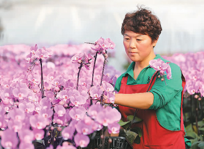 近年来,山东省青岛市即墨区灵山街道大力发展蝴蝶兰、仙客来等多个品种的特色花卉种植,结合市场需求推行线上和线下相结合的销售模式,将产品销往全国各地,带动农民增收。图为1月7日,花农在灵山街道的一个花卉种植大棚里管护花卉。