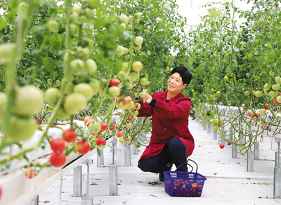 浙江省台州市路桥区螺洋街道5G智慧农业产业园“植物工厂”内,工作人员在采摘水果番茄。 |