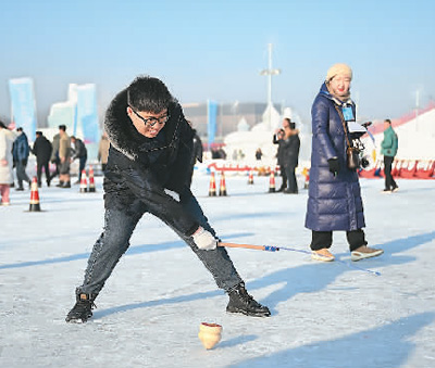 市民在内蒙古自治区呼和浩特市东河冰场上打冰陀螺。 |