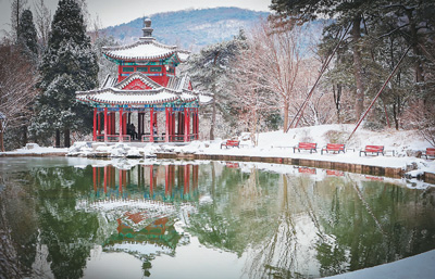 香山公园雪后眼镜湖及湖边佳日亭景致。 |
