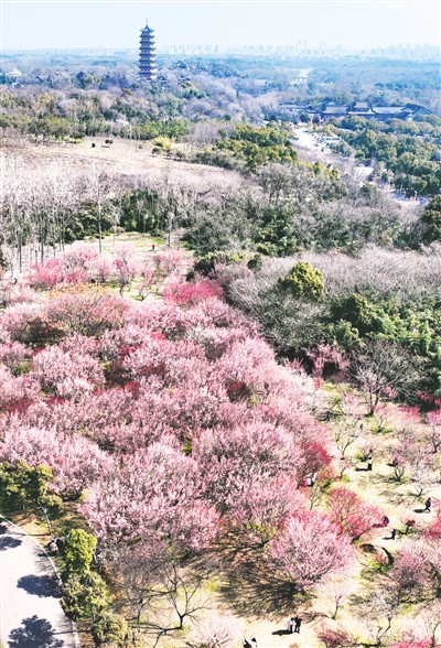 春暖花开,江苏省扬州市蜀冈西峰生态公园内的梅花竞相开放,生机盎然、美不胜收,吸引众多市民和游客前来踏青赏花,感受浓浓的春意。