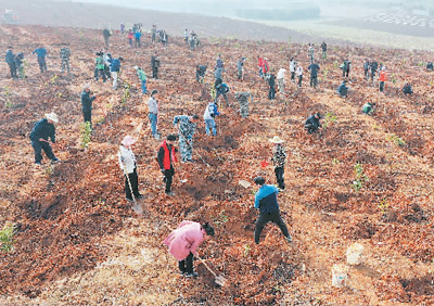 日前,在广西崇左市扶绥县渠旧镇崇边村国家储备林项目基地,当地干部群众参加义务植树。 |