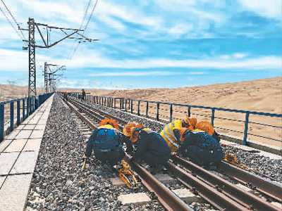 桥下,一群来沙漠里游玩的少年尽情拍照打卡,欣赏沙漠的美丽。桥上,记者爬到桥顶后,气喘吁吁,而维修工区的职工们没来得及喘一口气,就投入到作业中。