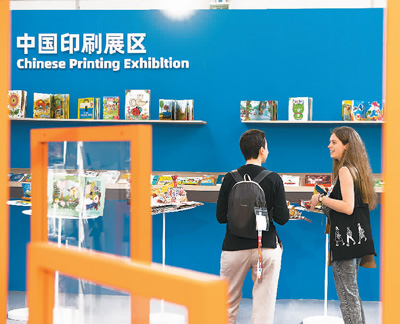 人们在博洛尼亚国际儿童书展中国图书展区参观。