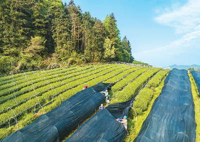 4月10日,在杭州市淳安县枫树岭镇“抹茶庄园”里,茶农们正在加铺遮阳网,提高茶叶品质。 |