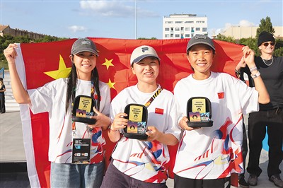 通过资格系列赛获得滑板女子街式巴黎奥运会参赛资格的中国选手朱沅铃、曾文蕙、崔宸曦(从左至右)在颁奖仪式上合影。 |