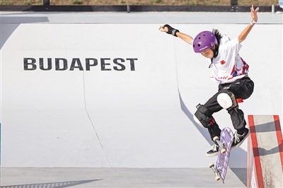 中国选手崔宸曦在巴黎奥运会资格系列赛布达佩斯站滑板女子街式决赛中。 |