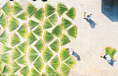 图为江背镇茂源村村民抢抓晴好天气,收割、晾晒席草,晒干后的席草将加工编制成草席,供应市场。