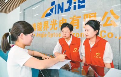 图为近日,蒙山镇党员志愿者来到镜界光电有限公司宣传人才政策,指导企业申报相关人才项目。