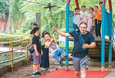 图为人们在广西壮族自治区梧州市太和体育公园体验游乐设施。 |