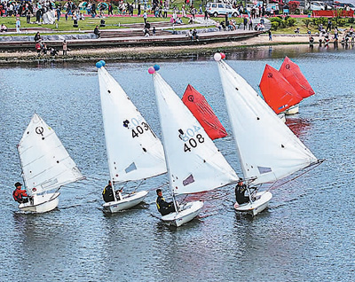 图为市民在山东省荣成市樱花湖体育公园进行水上运动。 |