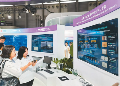 观众在中国联通展台体验“上海天文馆数字孪生平行世界”。 新华社记者 陈爱平摄