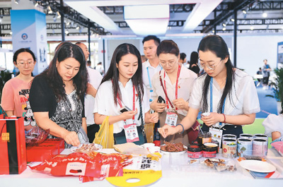 7月6日,第三十届中国兰州投资贸易洽谈会在甘肃国际会展中心开幕。据悉,本届兰洽会由甘肃省人民政府主办,中国—东盟中心等11家单位协办,以“共享机遇,共谋发展,共创繁荣”为主题,吸引国内外2200余家企业参会参展。图为参会者在第三十届兰洽会山东展馆品尝美食。