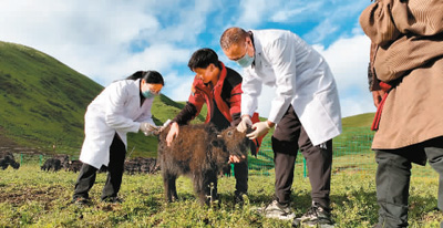图为果洛藏族自治州久治县动物疫病预防控制工作人员给牧民家中的牦牛“体检”。 |