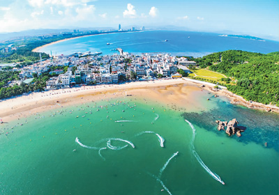 藤海村原本是海南省三亚市海棠区一个紧靠蜈支洲岛旅游区的普通渔村,近年来,在市区两级美丽乡村的规划扶持下,形成了以渔村民宿和冲浪基地两大产业为主的特色旅游名村,实现了由传统渔村到以发展旅游产业为主的和美渔村的蜕变。图为该村皇后湾海域一景。