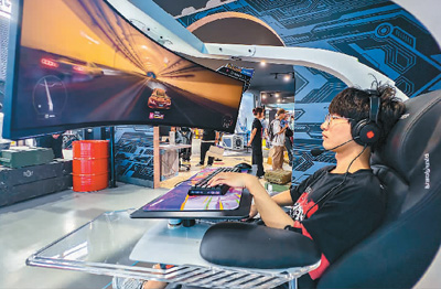 参观者在展台体验游戏。