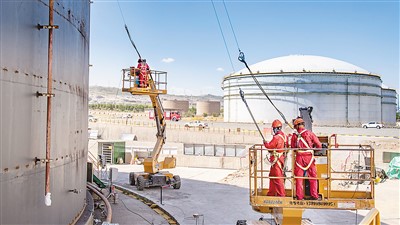 中国石油新疆油田公司王家沟油气储运中心施工人员在罐区加快施工保库容,有效保障油田生产后路畅通,助力新疆地区成品油、原油产业链平稳供应。图为施工人员在维修成品油储罐。 |