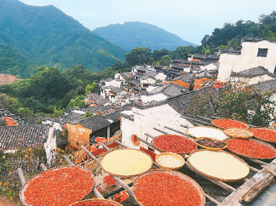 初秋的朝阳洒落在山间,氤氲的薄雾渐渐散开,百余米落差的山坡上,错落排布着一栋栋白墙黛瓦的民居,民居窗外伸出的晒架上,托举着圆圆的竹制大晒匾,里面盛满了红彤彤的辣椒、黄澄澄的玉米、金灿灿的柿子……远远望去,就像一幅清逸山村水墨画上的缤纷点缀。