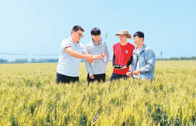2024年5月,中国农业大学科技小院研究生叶松林(左一)、郝展宏(右一)和王庄科技小院的学生,在河北省曲周县王庄村“绿色吨半粮”试验田中查看小麦长势。 |