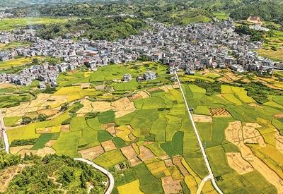 图为在福建省龙岩市连城县四堡镇,错落有致的民居与金黄的稻田、青山、道路勾勒出一幅美丽的生态田园画卷。连城县近年结合美丽乡村建设,打造生态宜居的和美乡村,通过农旅融合发展乡村旅游,促进农民增收。