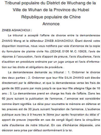 中华人民共和国湖北省武汉市武昌区人民法院公告 ZINEB AGHACHOUI:本院受理原告张萌诉被告ZINEB AGHACHOUI离婚纠纷一案,因你下落不明,现依法向你公告送达(2024)鄂0106民初10928号民事起诉状副本、应诉通知书、举证通知书、开庭传票、普通程序独任审理通知书、诉讼权利义务告知书。原告向本院请求:1.判令原、被告离婚;2.判令婚生女SILIA ZHANG由被告直接抚养,原告每月按人民币800元支付抚养费直至婚生女年满18周岁止;3.本案诉讼费由被告承担。自公告之日起满60日,即视为送达。提出答辩状和举证的期限均为公告期满后的30日内,并定于举证期满后的第3日上午9时(遇法定休假日顺延)在本院第五审判庭公开审理,逾期将依法缺席裁判。