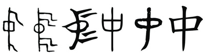 从左至右分别为甲骨文、金文、战国文字、小篆、隶书、楷书中的“中”字。 |