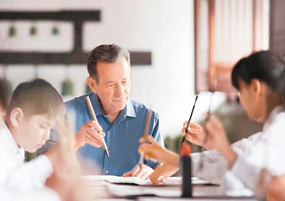 图为纪录片中,主持人迈克·沃尔特与中国小学生一起学习书法。 |