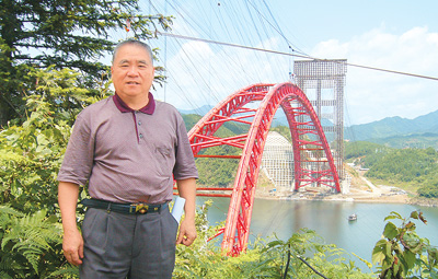 由郑皆连指导建造的安徽黄山太平湖大桥跨径达330米。图为郑皆连在施工现场。 |