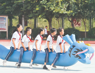近年来,广西梧州将大象拔河、竹竿舞、打陀螺等民族体育项目引进课堂,让学生在享受运动快乐的同时,接受民族团结进步教育。图为近日当地一所小学的学生体验“旱地龙舟”。