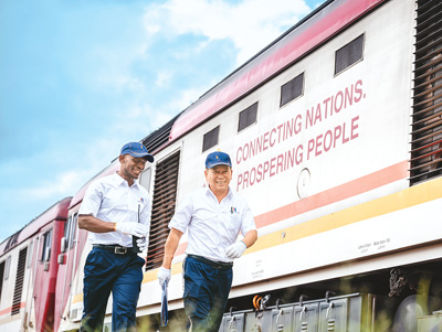在肯尼亚内罗毕,非洲之星铁路运营公司机辆部的火车驾驶员蒋立平(右)与学员霍勒斯从一辆蒙内铁路机车旁走过。 |