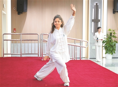 图为在中医药健康日活动上,德国友人蒂娜表演八段锦。