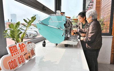 图为10月9日,在“忘不了”咖啡厅,周奶奶在社工的指导下制作拿铁咖啡。