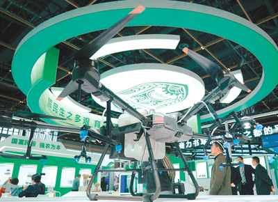 近日,2024世界农业科技创新大会在京举行。本届大会以“气候变化与农食系统转型”为主题。图为大会博览会上展示的一款植保无人机。
