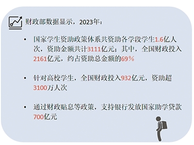 财政部发布的数据显示,2023年,国家学生资助政策体系共资助各学段学生1.6亿人次,资助金额共计3111亿元,其中全国财政投入2161亿元、约占资助总金额的69%;针对高校学生,全国财政投入932亿元,资助超3100万人次;通过财政贴息等政策,支持银行发放国家助学贷款700亿元,有力缓解了家庭经济困难学生的经济压力。