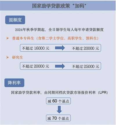 提额度——自2024年秋季学期起,全日制普通本专科学生(含第二学士学位、高职学生、预科生)每人每年申请贷款额度由不超过16000元提高至不超过20000元;全日制研究生每人每年申请贷款额度由不超过20000元提高至不超过25000元。学生申请的国家助学贷款优先用于支付在校期间学费和住宿费,超出部分用于弥补日常生活费。
