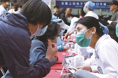 5月6日世界哮喘日。北京大学人民医院门诊大厅内,一场聚焦呼吸道健康的公益咨询活动火热开展。本次义诊提供免费肺功能检测、血糖监测等服务,帮助患者及时掌握自身健康状况。图为义诊现场。健康时报记者牛宏超摄