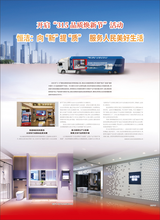 2025年“3·15”国际消费者权益日即将来临之际,恒洁卫浴集团有限公司(简称“恒洁”)发起“焕新中国行·315品质焕新节”活动。作为国内卫浴行业领军品牌,恒洁积极响应消费品以旧换新政策,两度参与商务部重点消费促进活动,并将落实以旧换新政策作为推动产业升级的重点抓手,通过推动智能制造升级、产品创新与服务升级,满足消费者对品质生活的更高追求,展现出民营企业在高质量发展进程中的担当与作为。