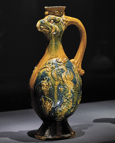 汉唐时期,西域食材及饮食习惯逐渐经丝绸之路传入中国,中外饮食风俗文化不断交汇、融合。展出的这把唐代凤首壶以三彩釉陶制成,壶身修长、凤冠高耸,把手和流口展示了西方以倾注方式倒酒的饮俗如何改变中原盛酒的习惯。
