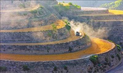 近年来,甘肃省庆阳市镇原县在保障粮食安全的同时,优化产业结构、推动绿色转型,走出一条现代农业发展之路。图为6月16日,镇原县十八岘村村民加紧抢收梯田小麦。