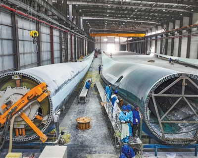 在上海电气贵州龙里风电产业园内,工人在生产风机叶片。