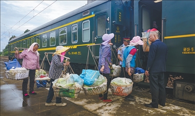 5652/1次旅客列车每天往返于云南昆明与贵州红果之间,是一趟公益“慢火车”。图为7月19日,云南省曲靖市马龙区吴官田火车站,村民们登上列车,准备前往市区售卖农产品。