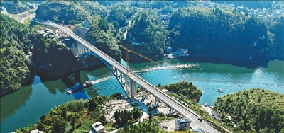 近日,贵州省铜仁市连接德江县与沿河土家族自治县的夹石特大桥建成通车,结束了乌江两岸15万名群众仅靠渡船往来的历史,将促进黔东北区域融合发展。图为10月8日拍摄的夹石特大桥。
