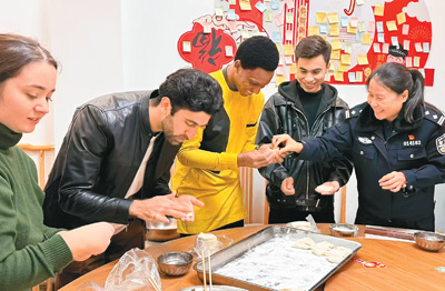 江西省南昌市公安局红谷滩分局红角洲派出所邀请外国留学生一起包饺子过大年,了解中华美食文化。