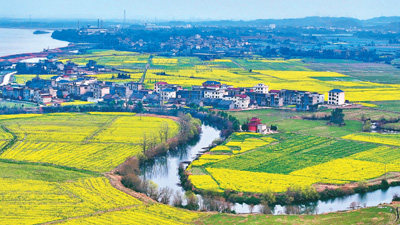 3月31日,江西省抚州市临川区桐源乡池溪村,连片农田与河流相映成景,和美如画。