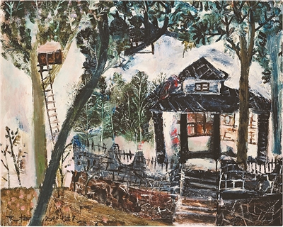 《我在杭州的家》和《无题(寺庙和坟墓)》是赵无极在杭州任教阶段的重要创作。《我在杭州的家》描绘了他与家人在西湖边的居所,杭州的湖光山色、宋韵气息,为他的艺术创作提供了丰富的灵感和滋养,启发了赵无极对风、光、气等不可见事物的表现与追求。《无题(寺庙和坟墓)》描绘的是杭州西湖边南宋爱国将领岳飞的墓地,这不仅是对杭州历史遗迹的艺术再现,也是赵无极内心深处家国情怀的体现。